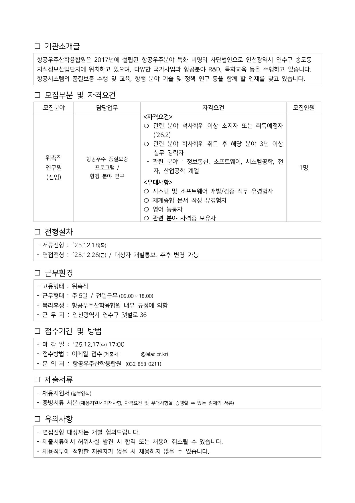 클릭 [(사)항공우주산학융합원] 항공우주산학융합원 위촉직 연구원 채용(연구개발)