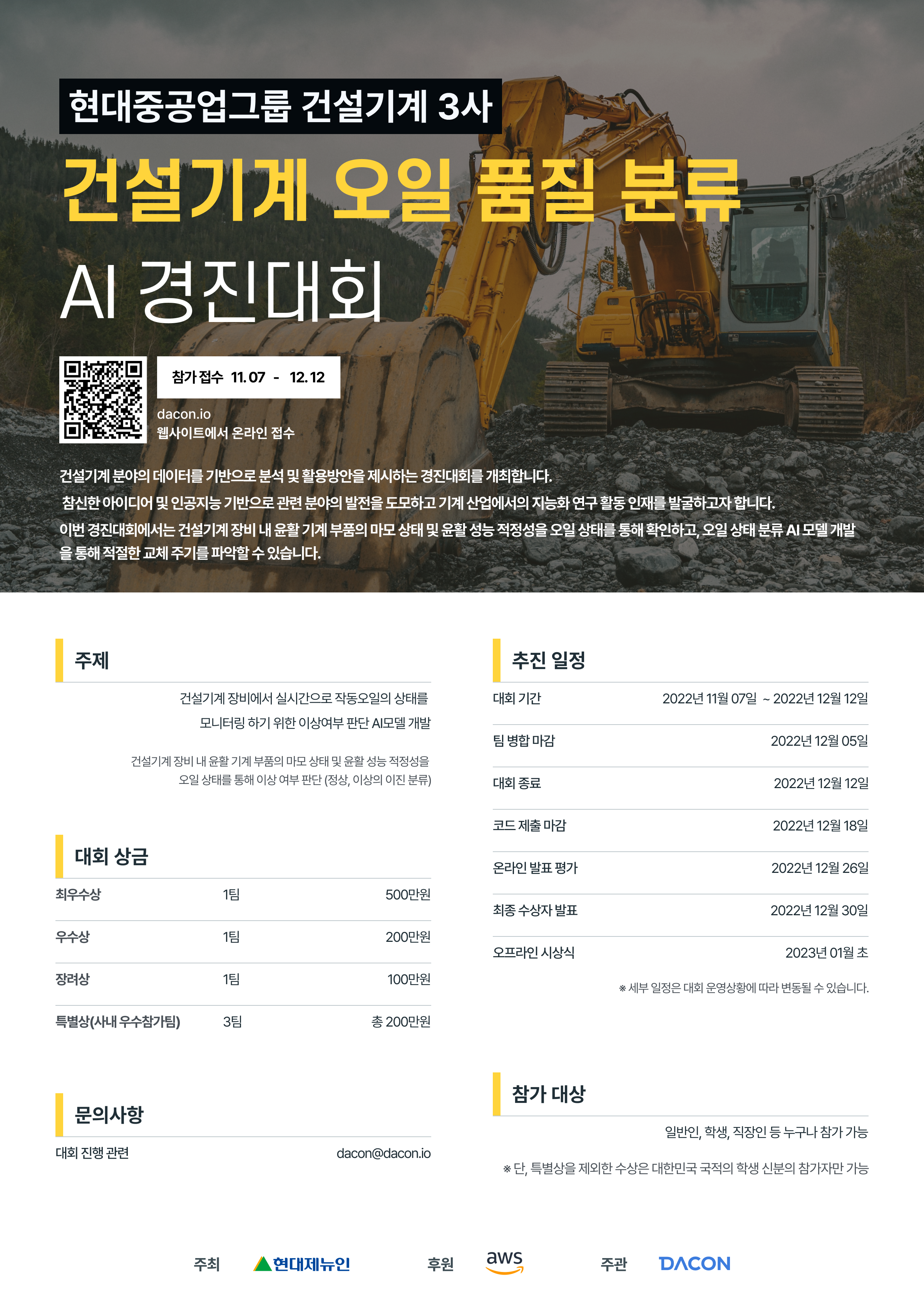 건설기계 분야 우수 AI 적용 사례 및 알고리즘 발굴, 인재 채용 연계 및 그룹사 우수자 시상을 위한 AI Data Challenge를 개최 하고자 합니다.